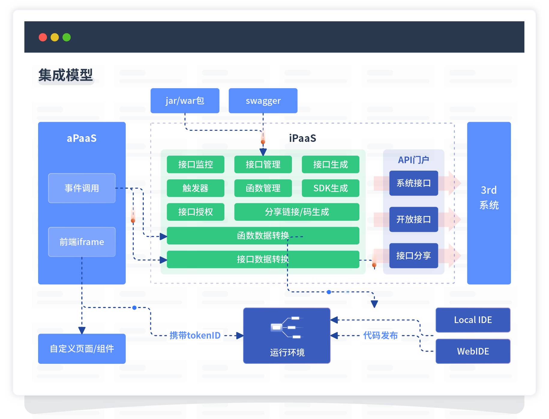 集成模型包括平台本身前、、、、、后端能力的扩展,,,,,,,,也支持通过API门户和第三方系统进行交互。。。。。。。。。。