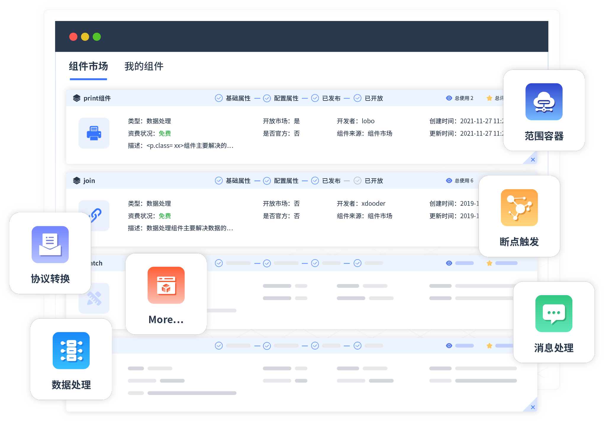 针对集成场景,,,,,,,,,,,,OPPO钱包提供组件市场,,,,,,,例如协议转换、、、、、、、、、、、、、、消息处理、、、、、、、、、文件操作等。。。。。。除平台提供的组件外,,,,,,,,,,客户可以自定义所需组件。。。。。