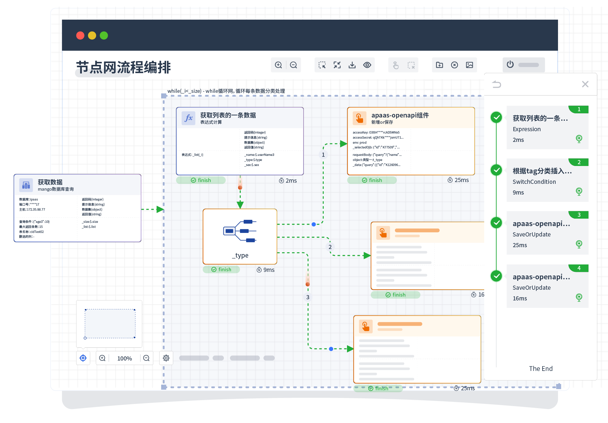针对集成场景,,,,,,,组件定义后支持进行流程编制,,,,,,,,,,不同于传统代码方式,,,,,,,,,,,,,通过图形化展示,,,,,,,,支持在线调试、、、、、、、、、、、、日志查看和运行回放。。。。。。。。。