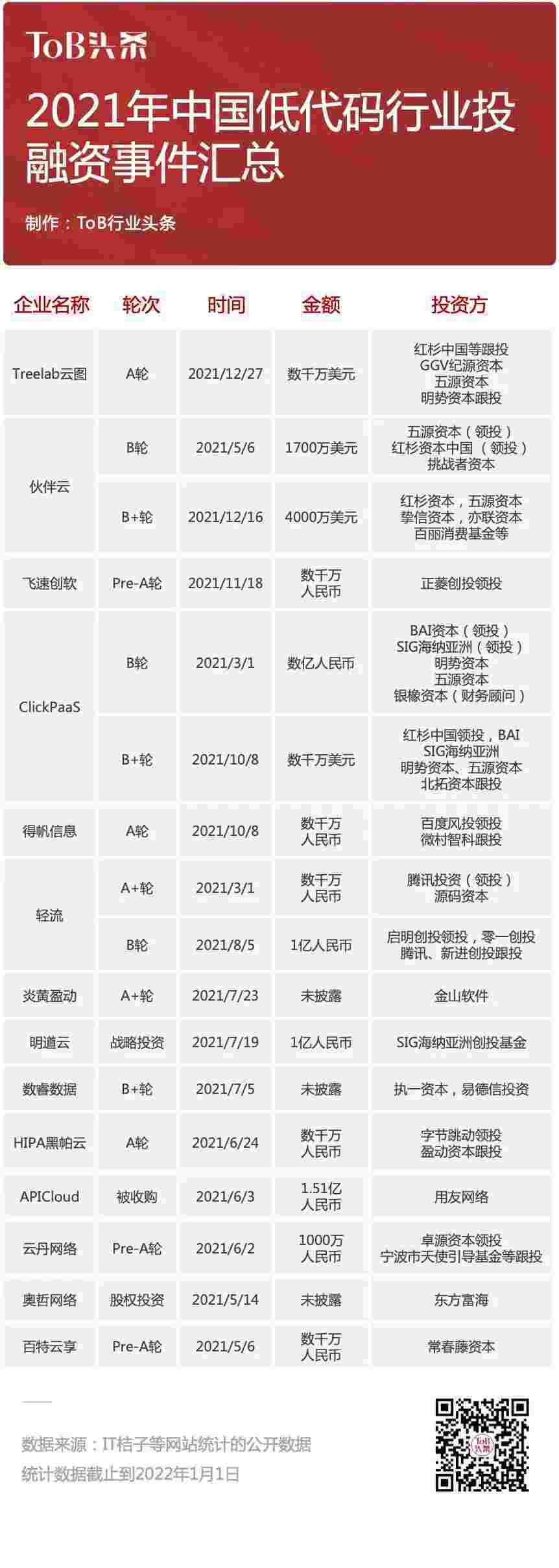 同期的国内市场同样战绩频频,,,,,从2018-2020年,,,,,,,中国无/低代码领域总体投融资事件共16起。。。。。。。。。。