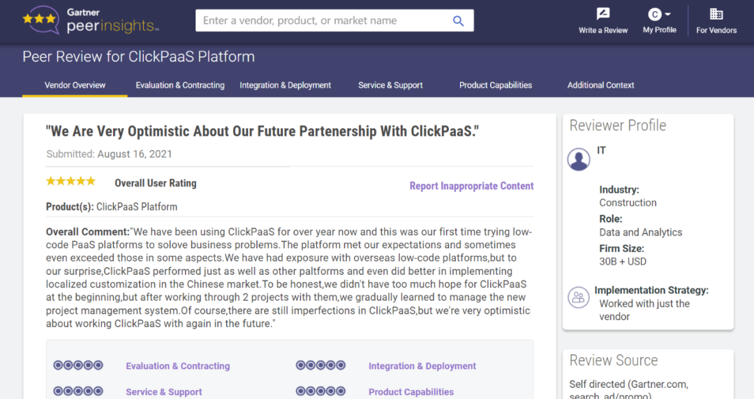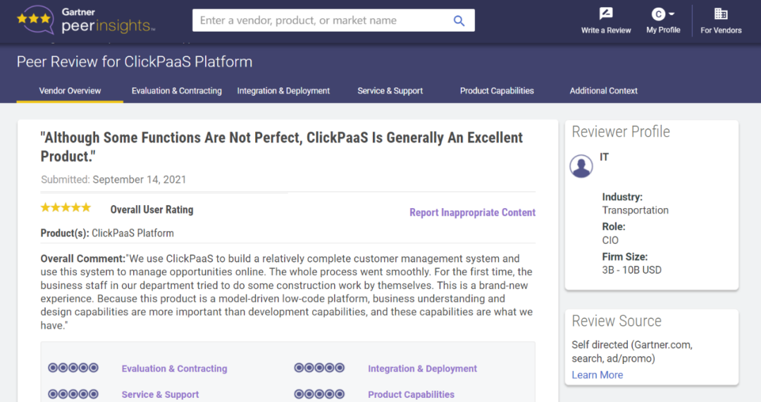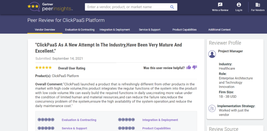 Tips::::::【Peer Insights】——用户对企业IT产品和服务发布真实评价的平台。。。。。。。目前已有355个市场,,,,,,255,000条经过验证的评价。。。。。。。。。。每一条评价Gartner会针对参评企业营收规模及参评人员信息做验证、、、、评价内容做多维核实。。。。。。。。。。。。。